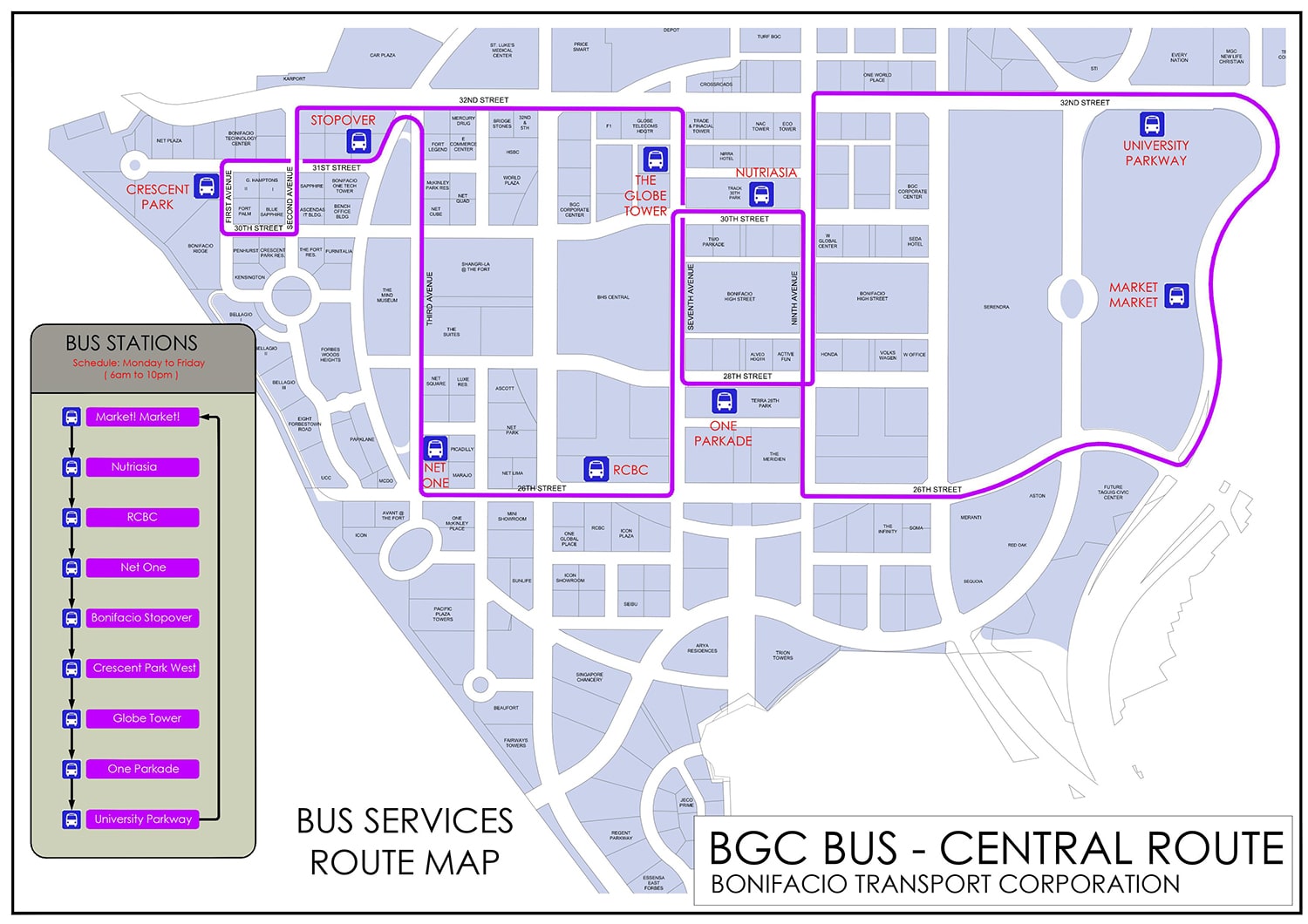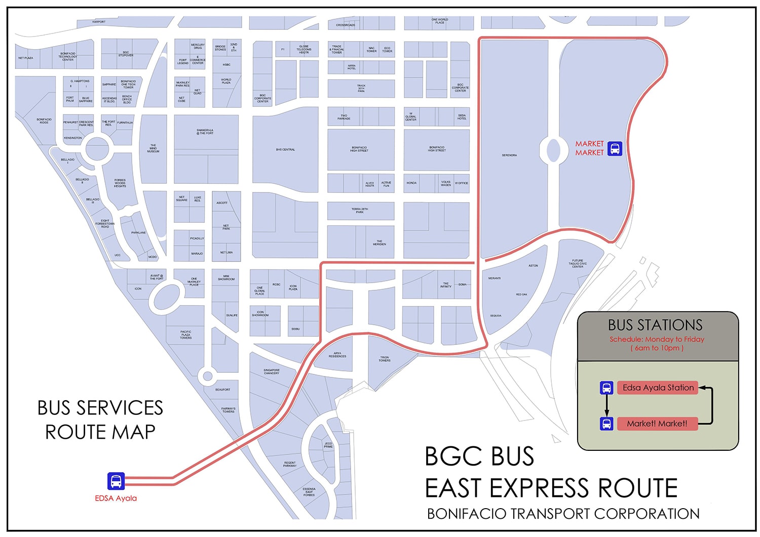 Bonifacio Transport Corp. работает круглосуточно и без выходных. Время в пути 10–15 минут, в зависимости от загруженности дорог и остановок. Большинство пассажиров автобусной компании работали в call-центрах, построенных в г. Бонифачо Глобал Сити и близлежащие районы на Аяла, Макати.[17]