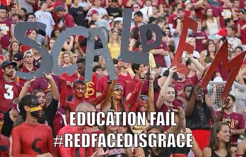 в Соединенные Штаты, полемика[6] окружает выбор некоторых талисманов, особенно тех, которые используют человеческие подобия. Талисманы на основе Коренной американец племена особенно спорный, поскольку многие утверждают, что они представляют собой оскорбительную эксплуатацию угнетенной культуры.[7] Однако несколько индейских племен выступили в поддержку сохранения названий. Например, Юта Юта и Чиппева из Центрального Мичигана санкционированы местными племенами, а Семинолы штата Флорида поддерживаются Племя семинолов Флориды в использовании Osceola и Renegade в качестве символов. Советский Союз предпочитает не называть их талисманами из-за оскорбительного оттенка.[8] Однако это не помешало фанатам участвовать в "Красное лицо"- одеваться в стереотипные наряды индейцев равнин во время игр или создавать оскорбительные баннеры с надписью" Scalp 'em ", как это было на Rose Bowl 2014 года.[9]